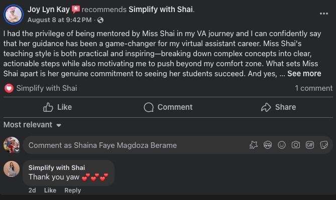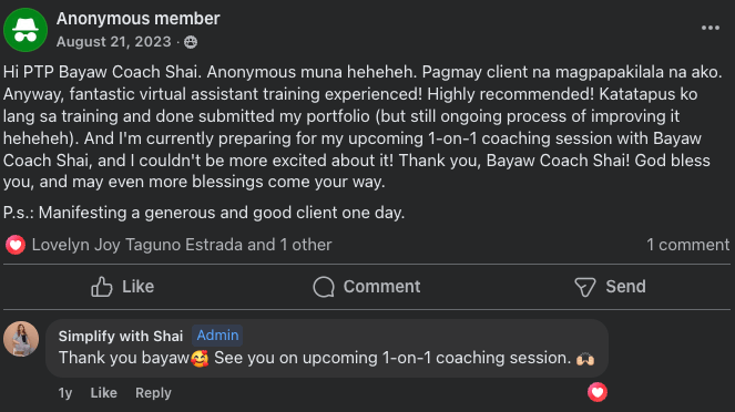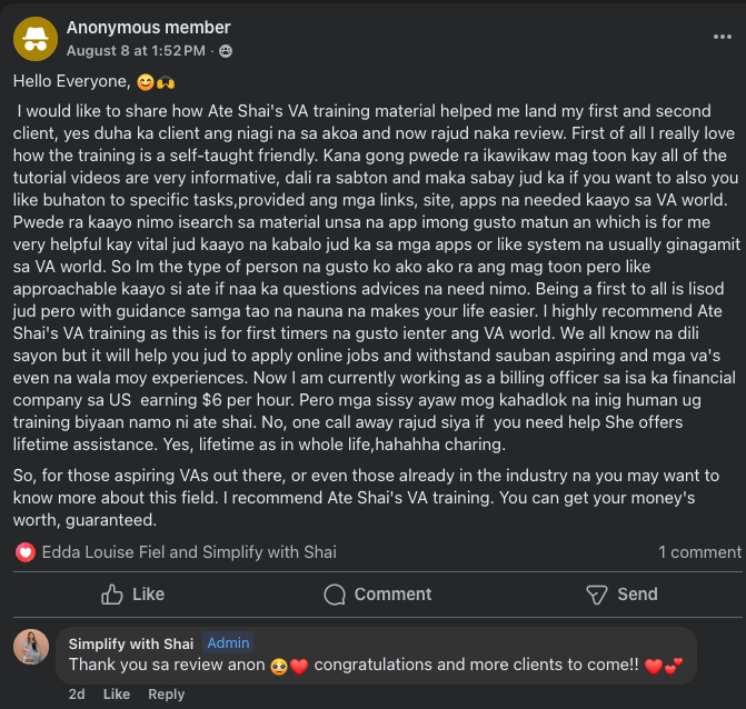 This VA training is designed to equip aspiring Filipino Virtual Assistants with the most in-demand skills so you can start confidently, land clients, and grow faster. It’s always open (no student limit), and you can begin right after you enroll. Videos are recorded so you can learn at your own pace, with unlimited help through DMs or email.