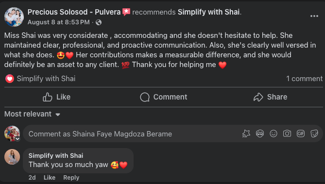 “Miss Shai was very considerate, accommodating and she doesn't hesitate to help. She maintained clear, professional, and proactive communication. Also, she's clearly well versed in what she does.”